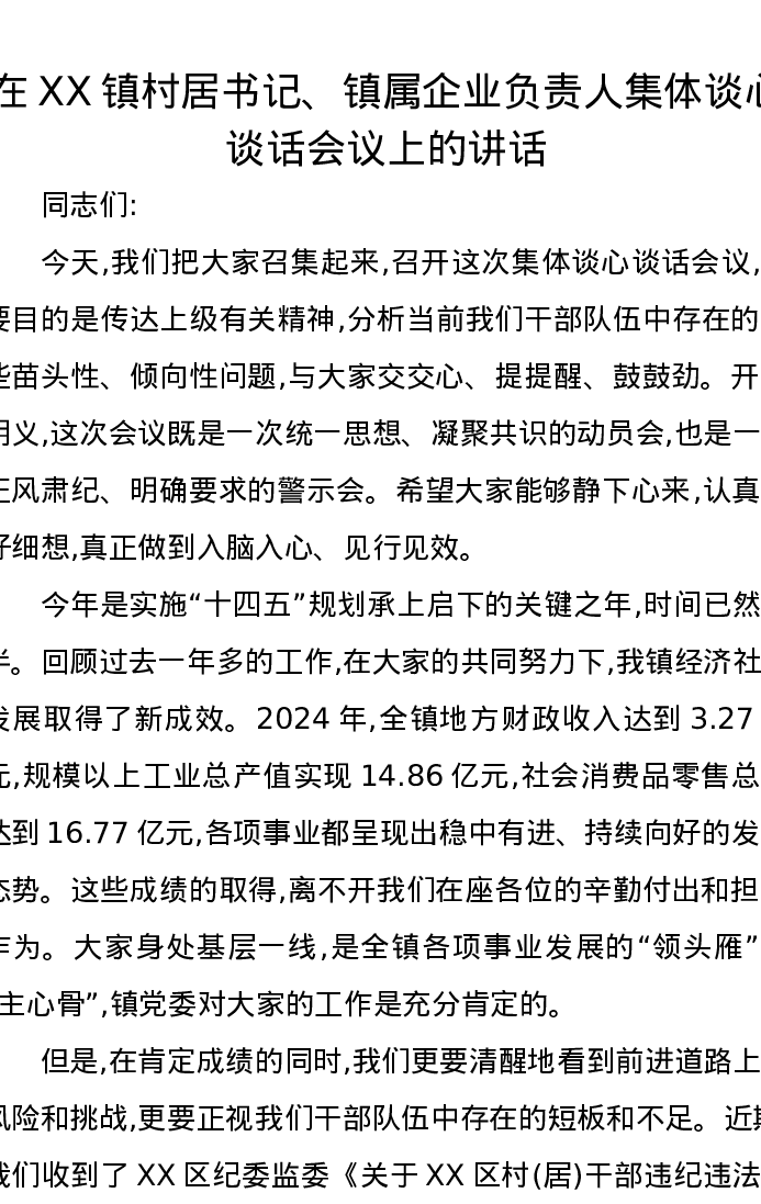 在XX镇村居书记、镇属企业负责人集体谈心谈话会议上的讲话