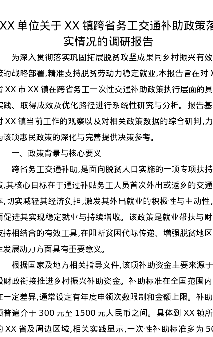 XX单位关于XX镇跨省务工交通补助政策落实情况的调研报告
