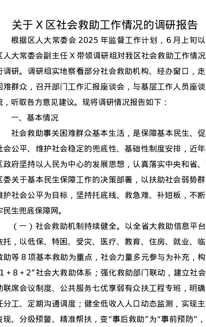 关于X区社会救助工作情况的调研报告