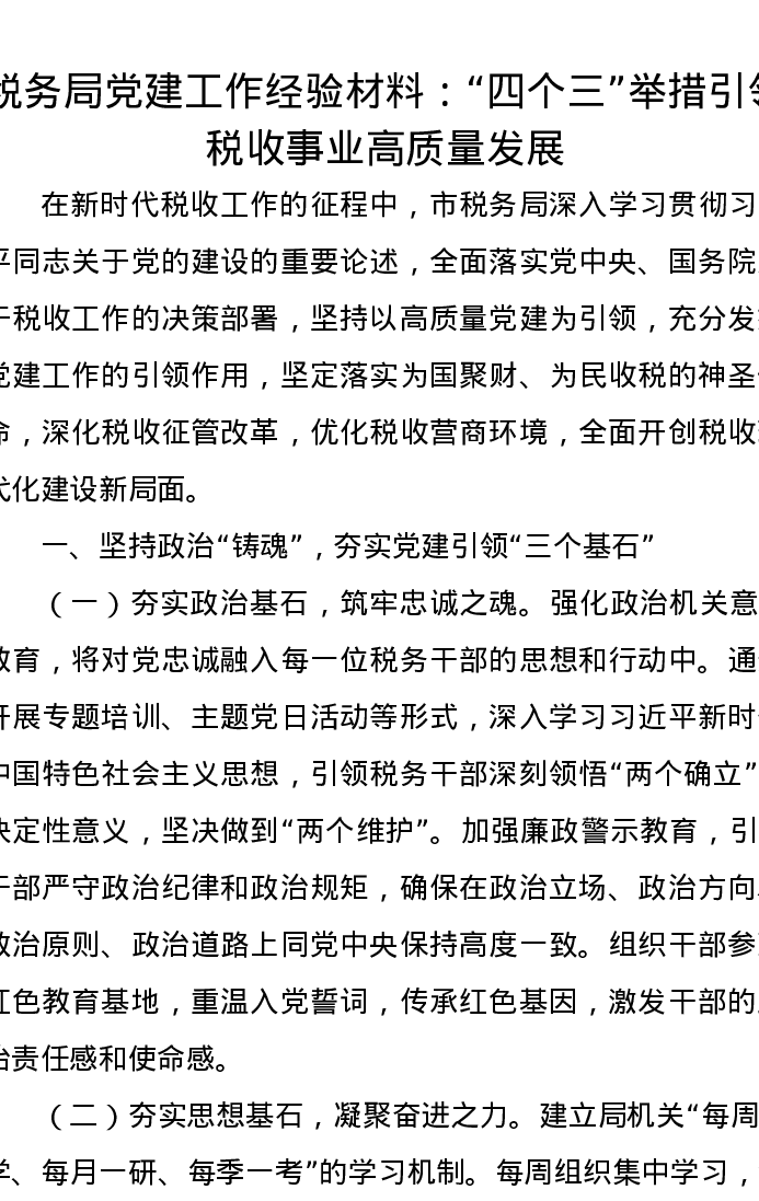税务局党建工作经验材料:“四个三”举措引领税收事业高质量发展