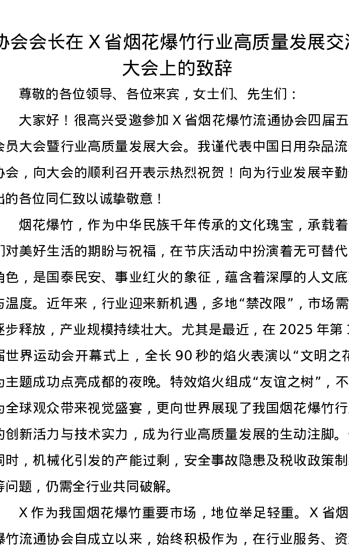 协会会长在X省烟花爆竹行业高质量发展交流大会上的致辞