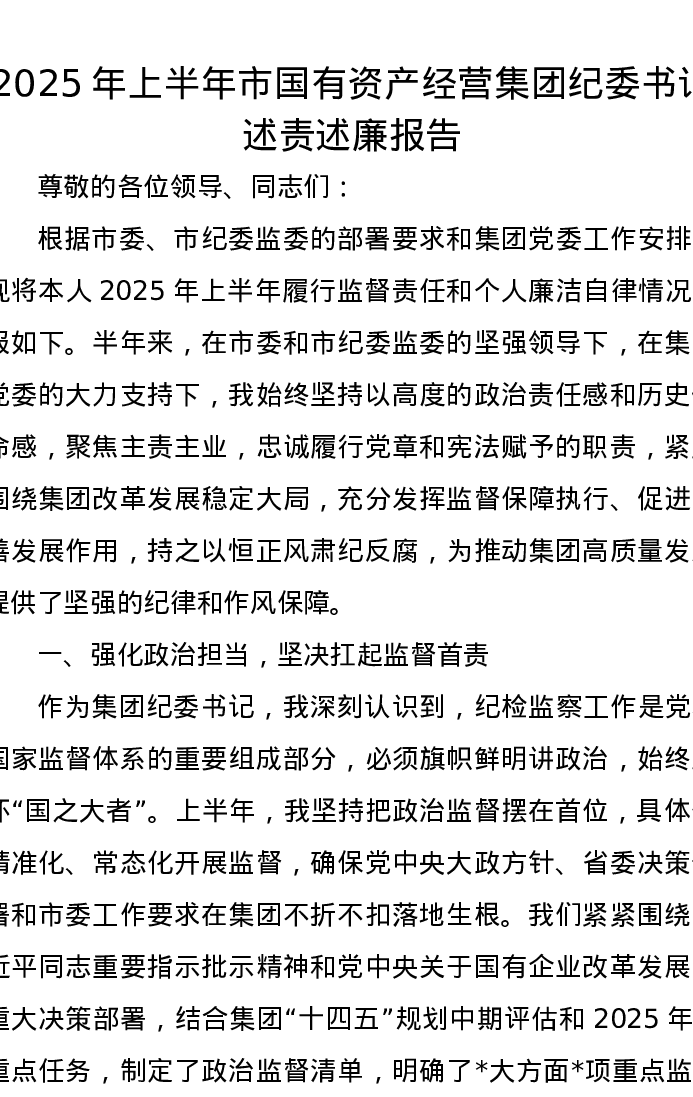 2025 年上半年市国有资产经营集团纪委书记述责述廉报告