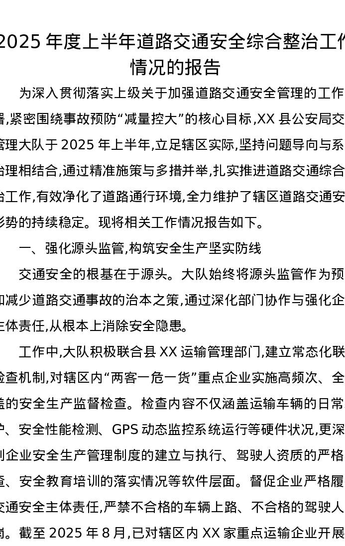 2025年度上半年道路交通安全综合整治工作情况的报告