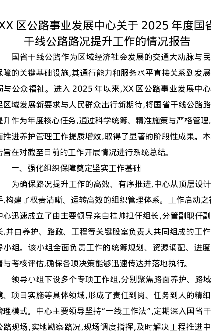XX区公路事业发展中心关于2025年度国省干线公路路况提升工作的情况报告