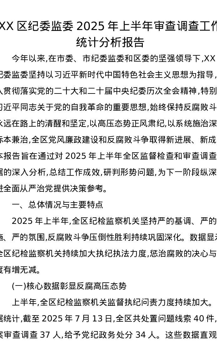 XX区纪委监委2025年上半年审查调查工作统计分析报告