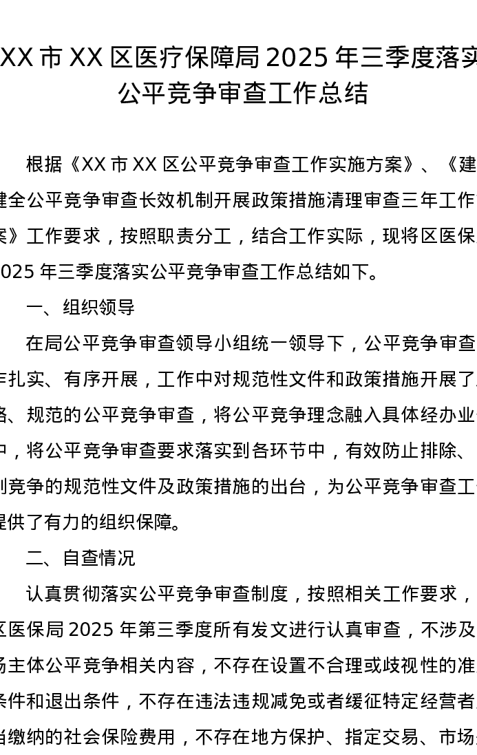 XX市XX区医疗保障局2025年三季度落实公平竞争审查工作总结