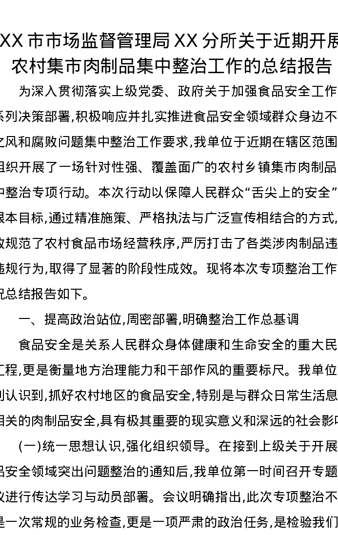 XX市市场监督管理局XX分所关于近期开展农村集市肉制品集中整治工作的总结报告