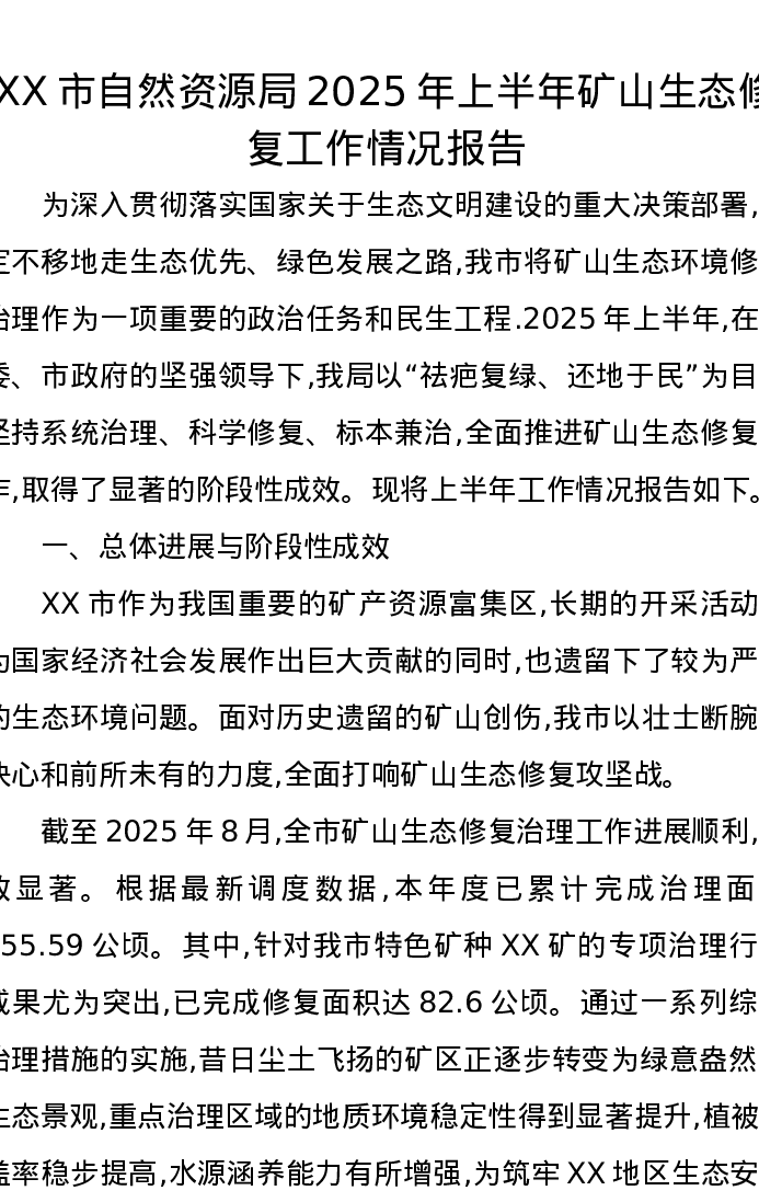 XX市自然资源局2025年上半年矿山生态修复工作情况报告