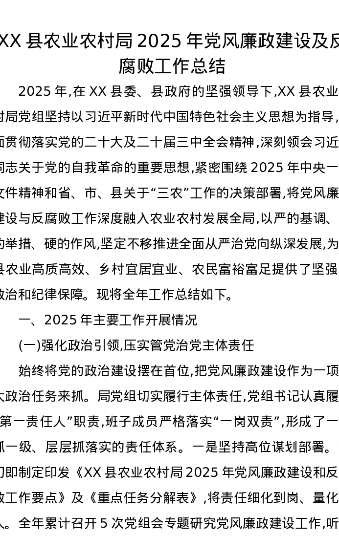 XX县农业农村局2025年党风廉政建设及反腐败工作总结