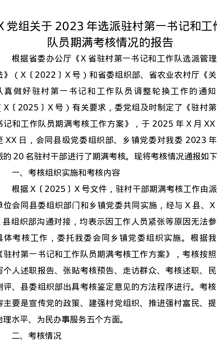 X党组关于2023年选派驻村第一书记和工作队员期满考核情况的报告