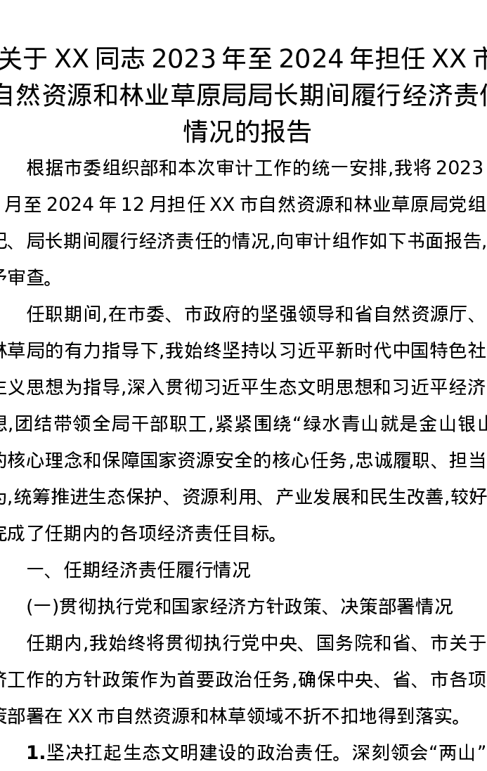 关于XX同志2023年至2024年担任XX市自然资源和林业草原局局长期间履行经济责任情况的报告