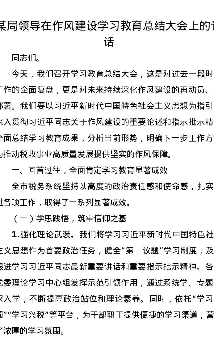 某局领导在作风建设学习教育总结大会上的讲话