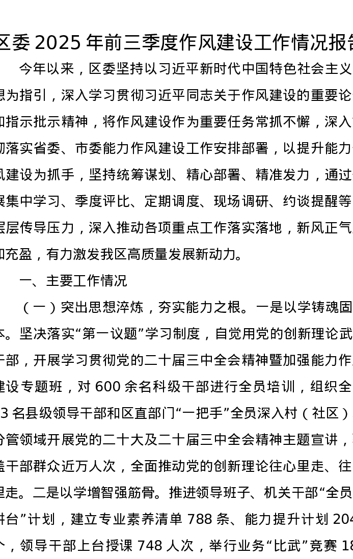 区委2025年前三季度作风建设工作情况报告