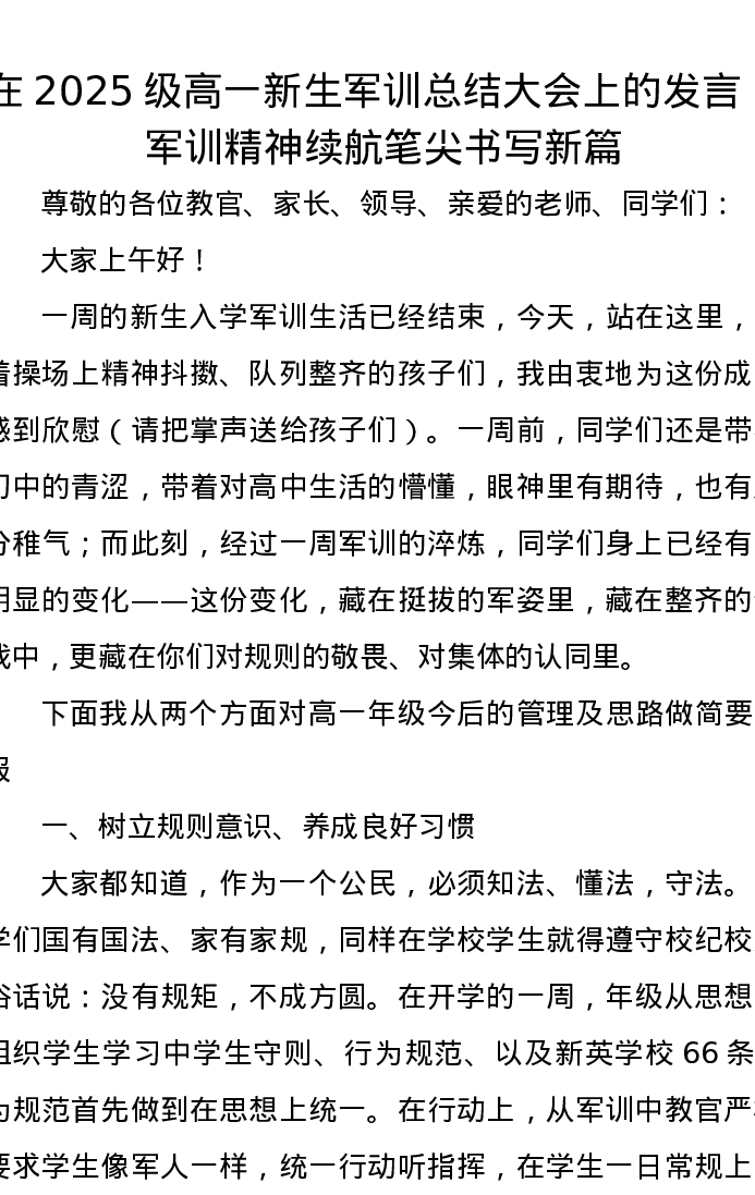 在2025级高一新生军训总结大会上的发言:军训精神续航笔尖书写新篇