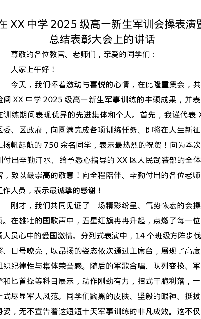 在XX中学2025级高一新生军训会操表演暨总结表彰大会上的讲话