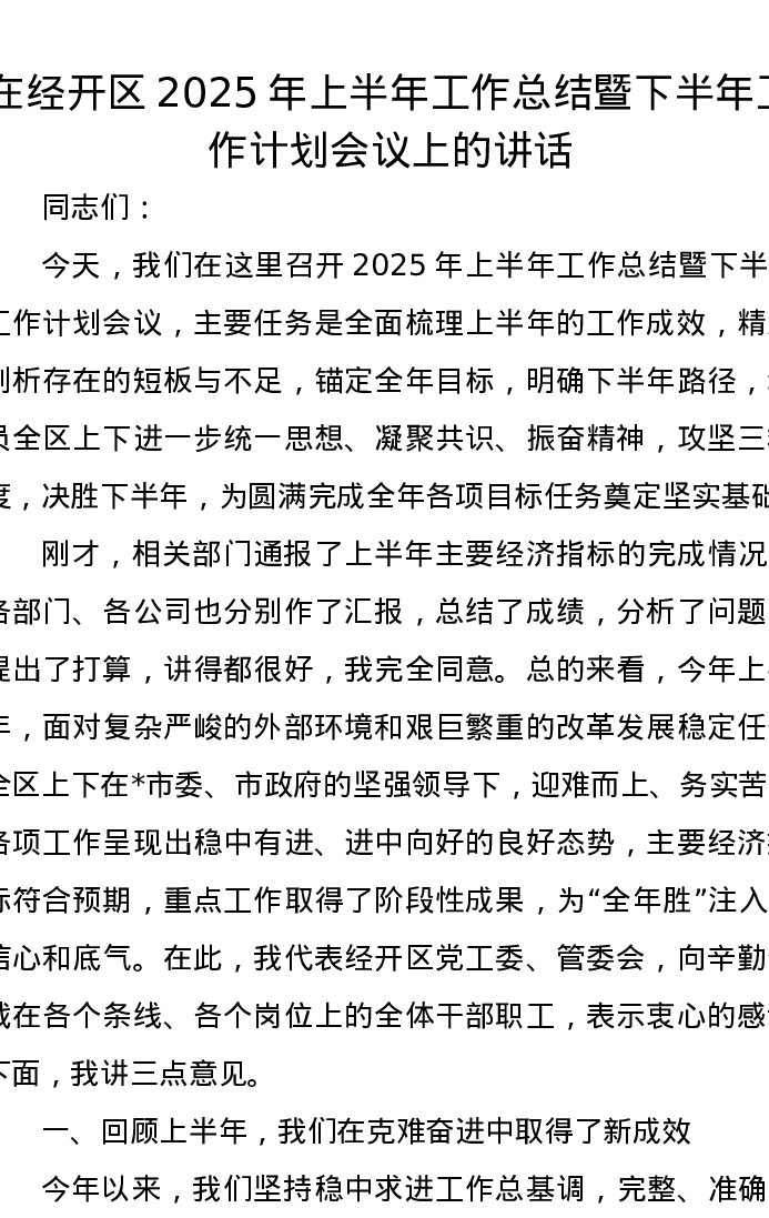 在经开区2025年上半年工作总结暨下半年工作计划会议上的讲话