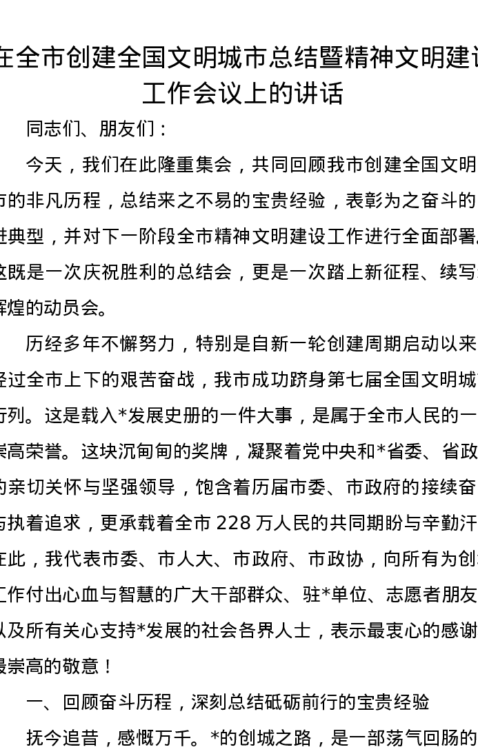 在全市创建全国文明城市总结暨精神文明建设工作会议上的讲话