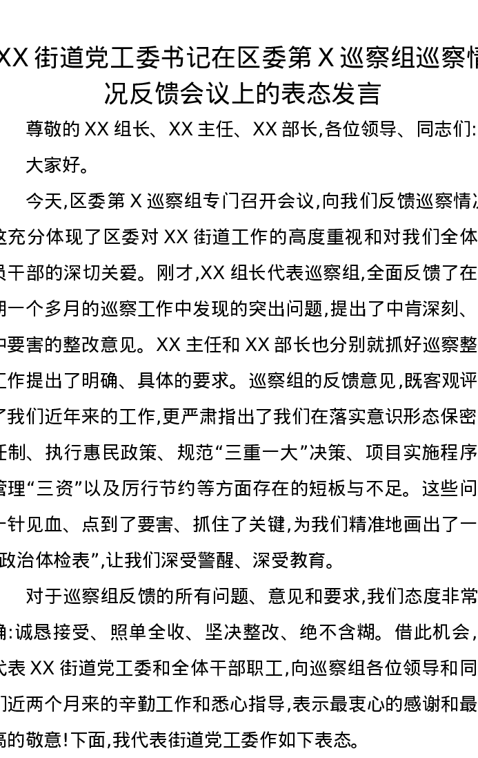 XX街道党工委书记在区委第X巡察组巡察情况反馈会议上的表态发言
