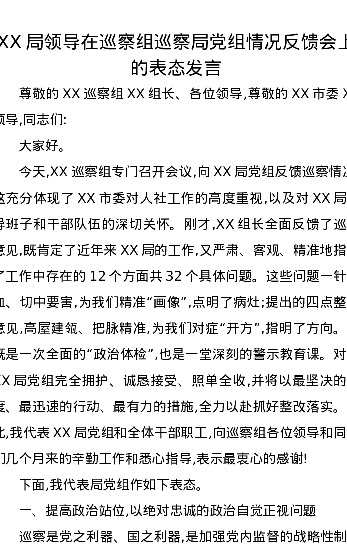 XX局领导在巡察组巡察局党组情况反馈会上的表态发言