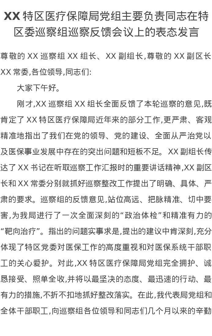 XX特区医疗保障局党组主要负责同志在特区委巡察组巡察反馈会议上的表态发言