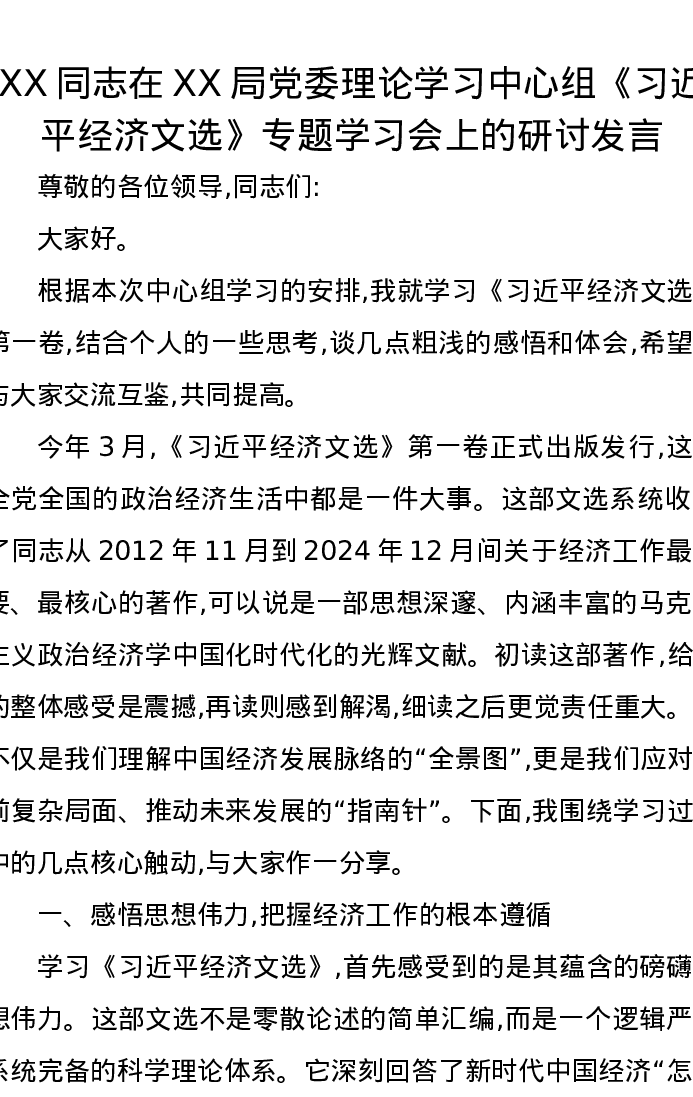 XX同志在XX局党委理论学习中心组《习近平经济文选》专题学习会上的研讨发言