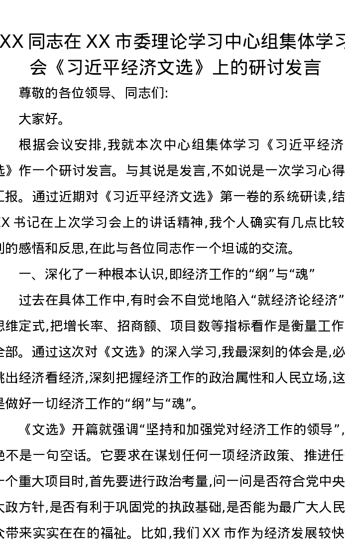XX同志在XX市委理论学习中心组集体学习会《习近平经济文选》上的研讨发言