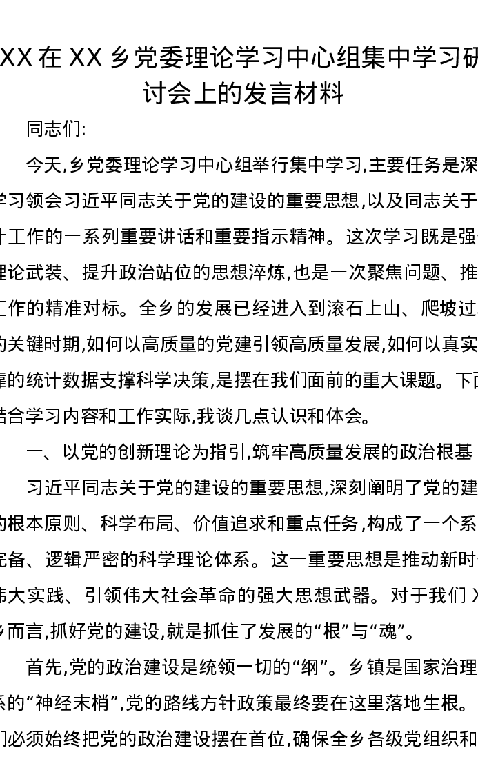 XX在XX乡党委理论学习中心组集中学习研讨会上的发言材料