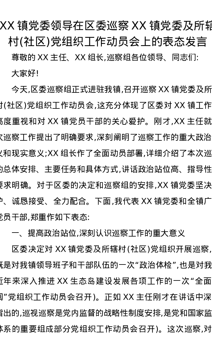 XX镇党委领导在区委巡察XX镇党委及所辖村(社区)党组织工作动员会上的表态发言