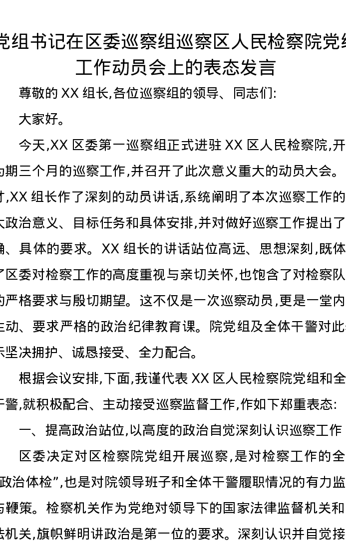 党组书记在区委巡察组巡察区人民检察院党组工作动员会上的表态发言
