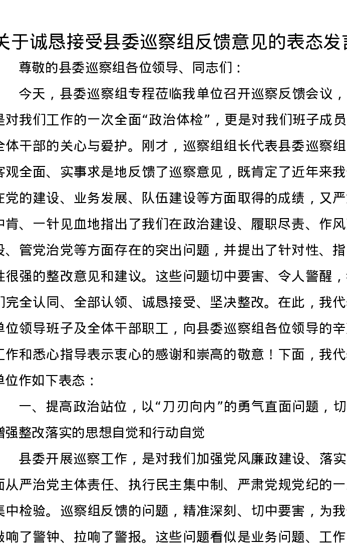 关于诚恳接受县委巡察组反馈意见的表态发言