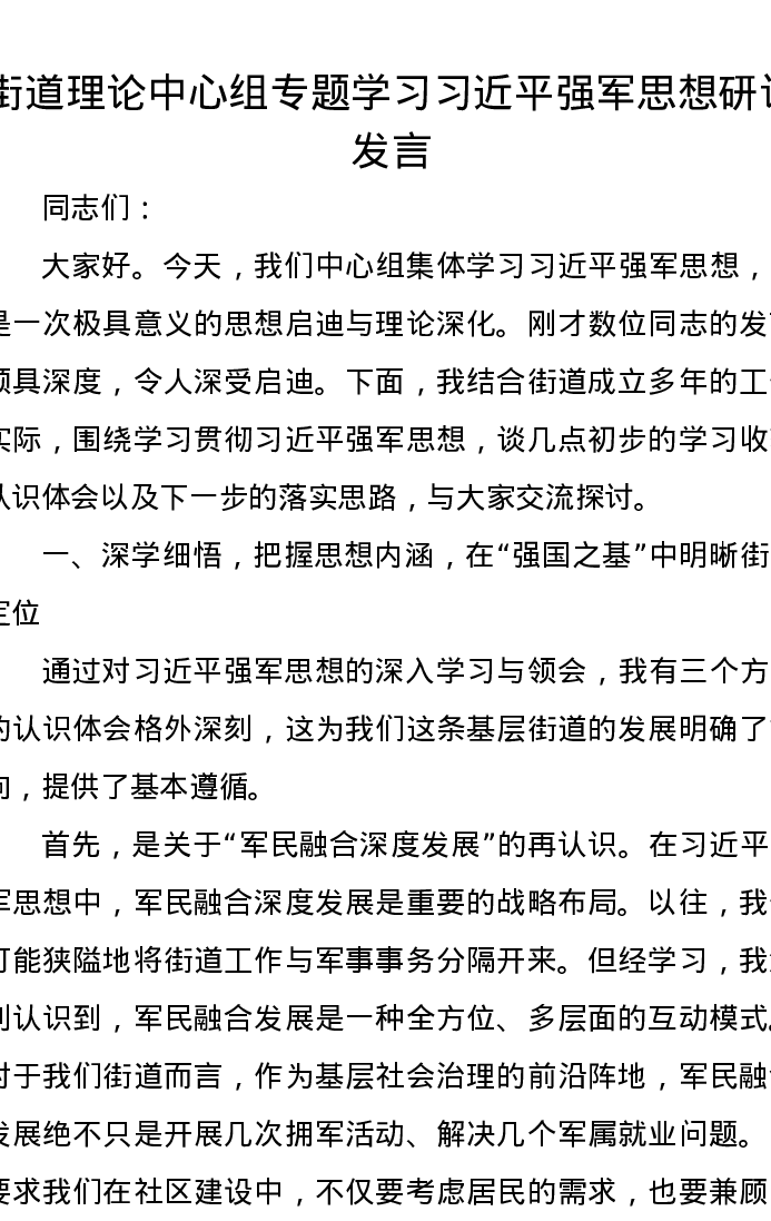 街道理论中心组专题学习习近平强军思想研讨发言