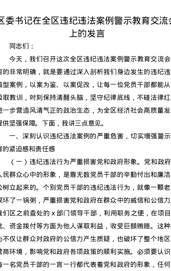 区委书记在全区违纪违法案例警示教育交流会上的发言