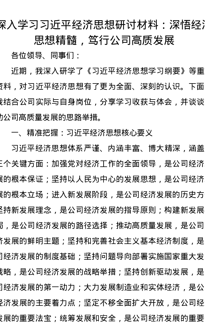 深入学习习近平经济思想研讨发言材料:深悟经济思想精髓,笃行公司高质发展