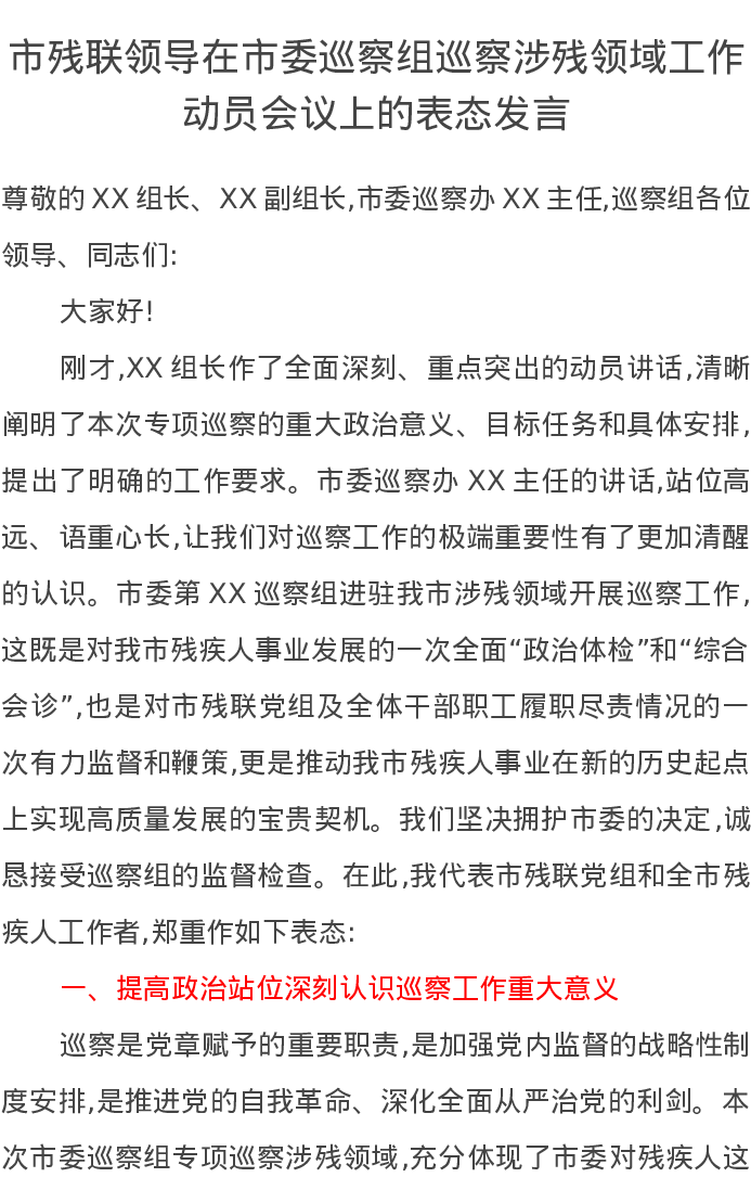 市残联领导在市委巡察组巡察涉残领域工作动员会议上的表态发言