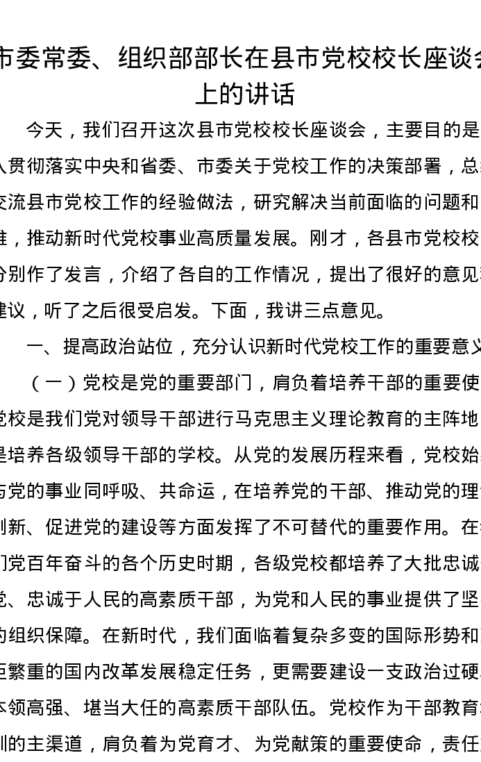 市委常委、组织部部长在县市党校校长座谈会上的讲话