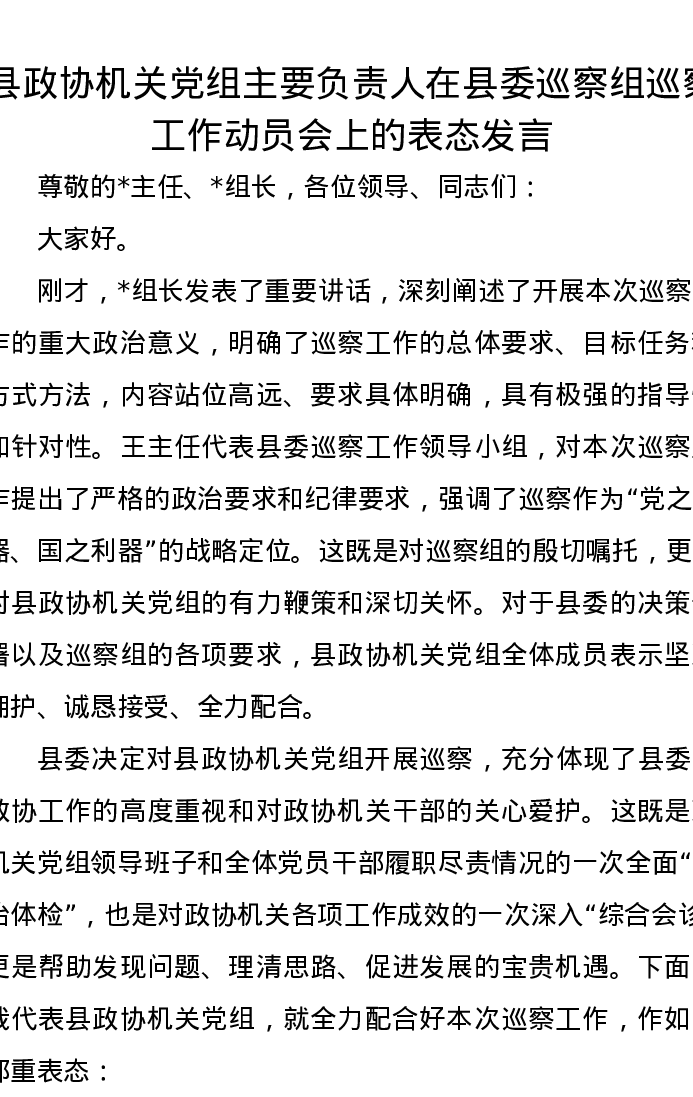 县政协机关党组主要负责人在县委巡察组巡察工作动员会上的表态发言