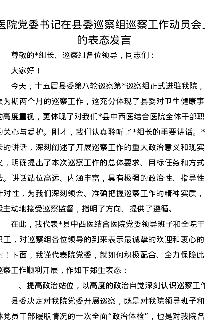 医院党委书记在县委巡察组巡察工作动员会上的表态发言