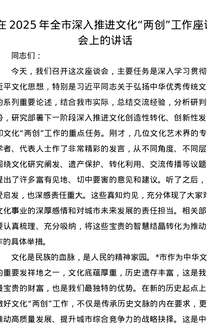 在2025年全市深入推进文化“两创”工作座谈会上的讲话
