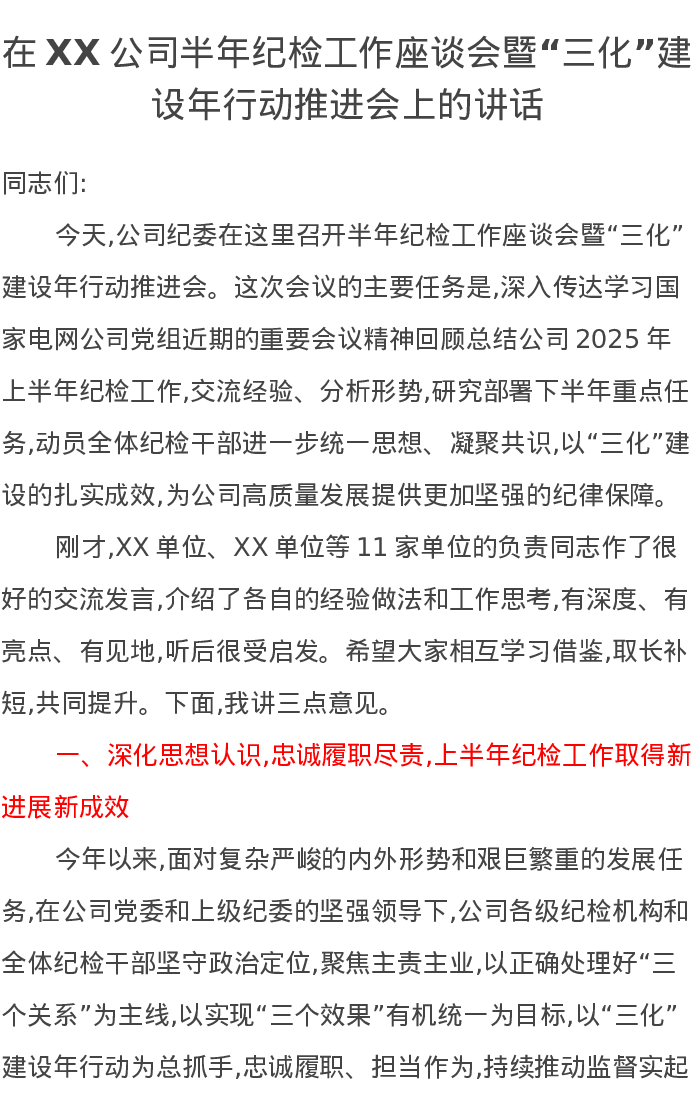 在XX公司半年纪检工作座谈会暨“三化”建设年行动推进会上的讲话