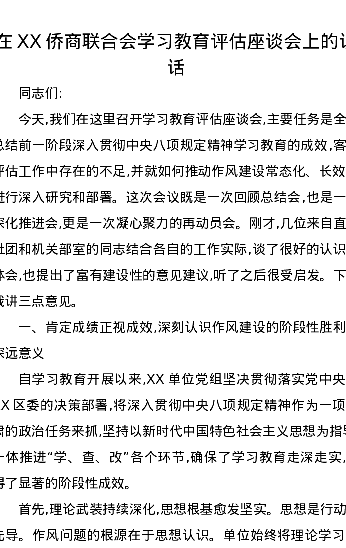 在XX侨商联合会学习教育评估座谈会上的讲话
