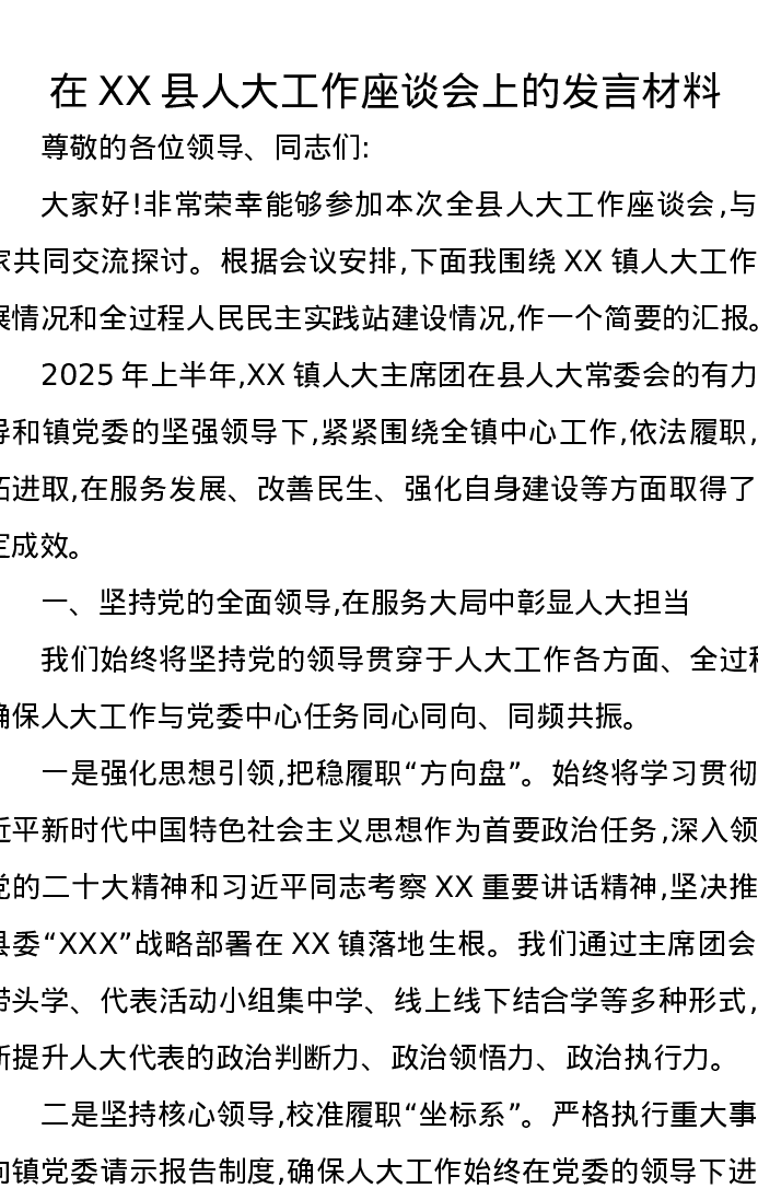在XX县人大工作座谈会上的发言材料