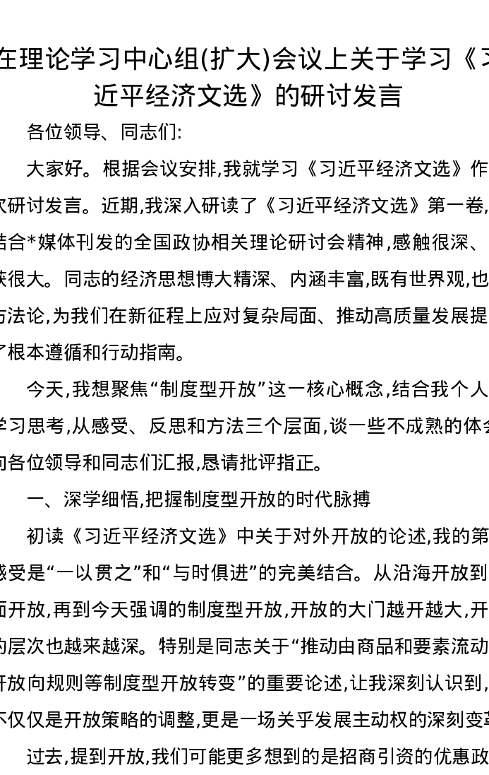 在理论学习中心组(扩大)会议上关于学习《习近平经济文选》的研讨发言