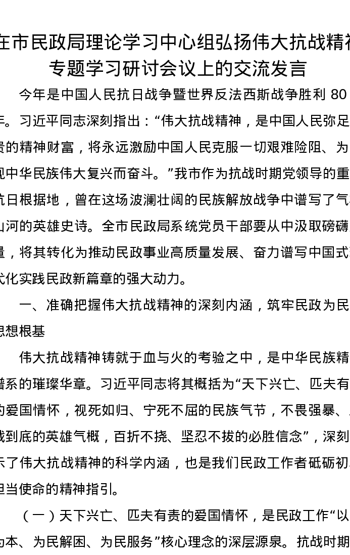 在市民政局理论学习中心组弘扬伟大抗战精神专题学习研讨会议上的交流发言
