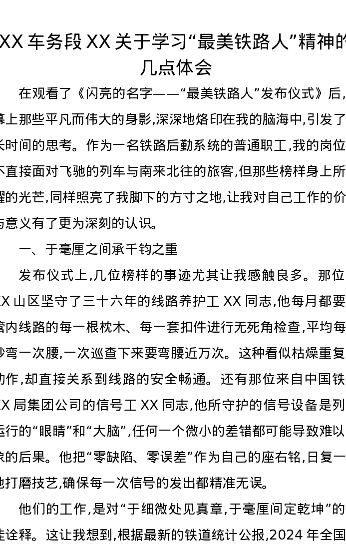 XX车务段XX关于学习“最美铁路人”精神的几点体会