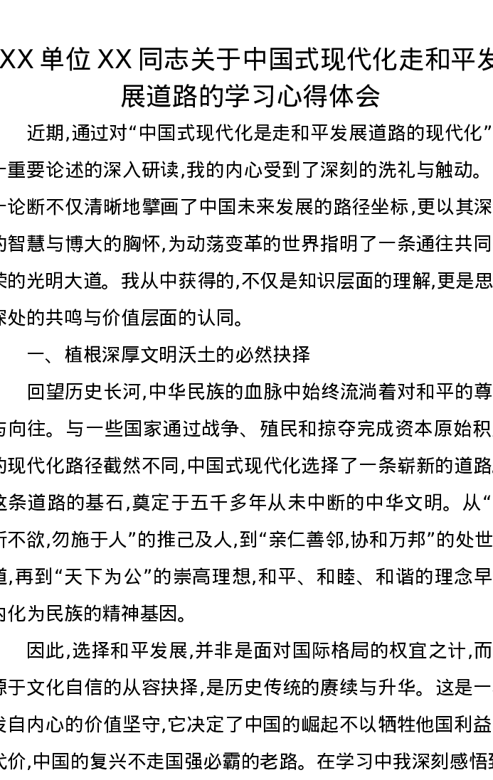 XX单位XX同志关于中国式现代化走和平发展道路的学习心得体会