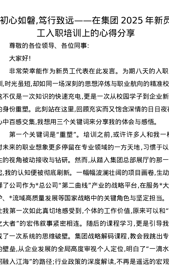 初心如磐,笃行致远——在集团2025年新员工入职培训上的心得分享