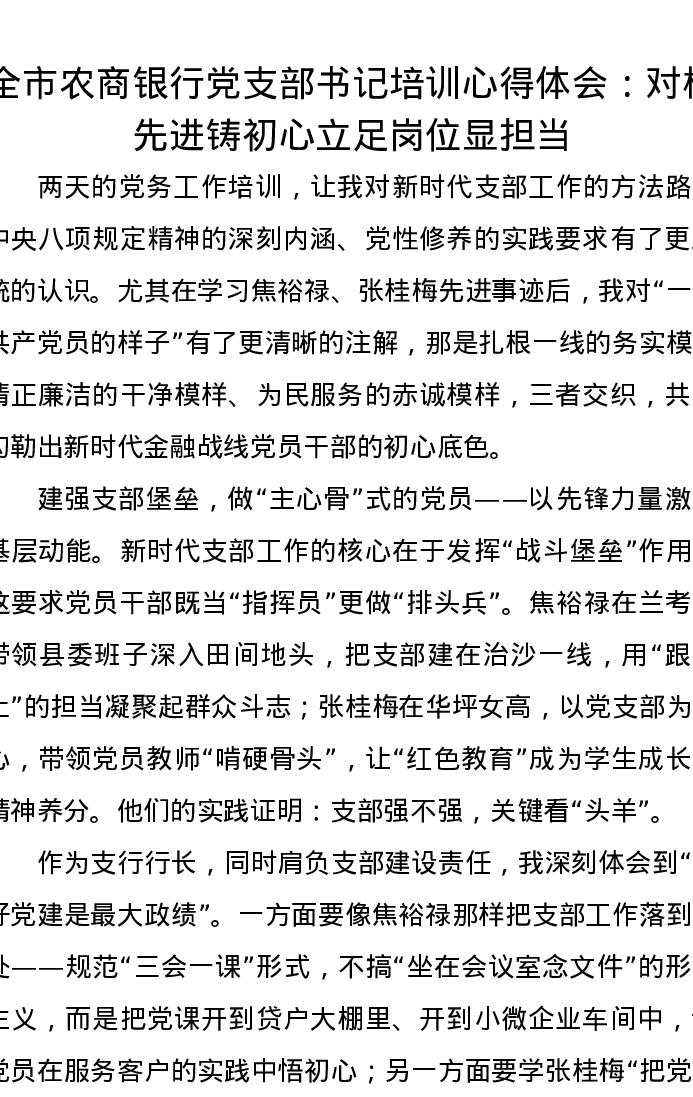 全市农商银行党支部书记培训心得体会:对标先进铸初心立足岗位显担当