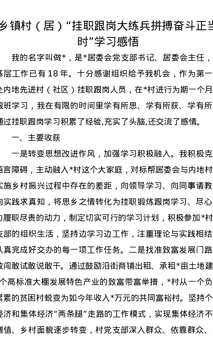 乡镇村(居)“挂职跟岗大练兵 拼搏奋斗正当时”学习感悟心得