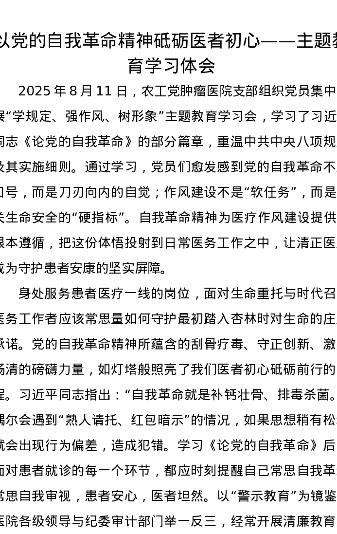 以党的自我革命精神砥砺医者初心——主题教育学习心得体会