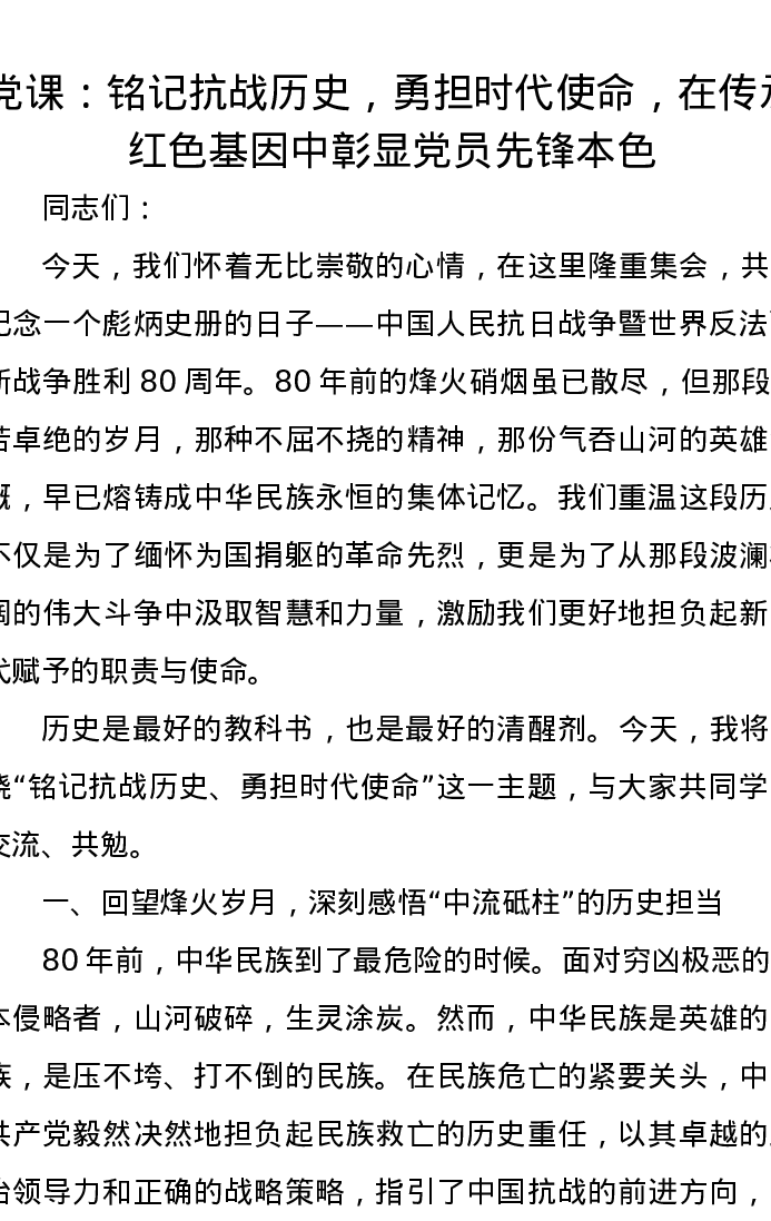 党课讲稿:铭记抗战历史,勇担时代使命,在传承红色基因中彰显党员先锋本色